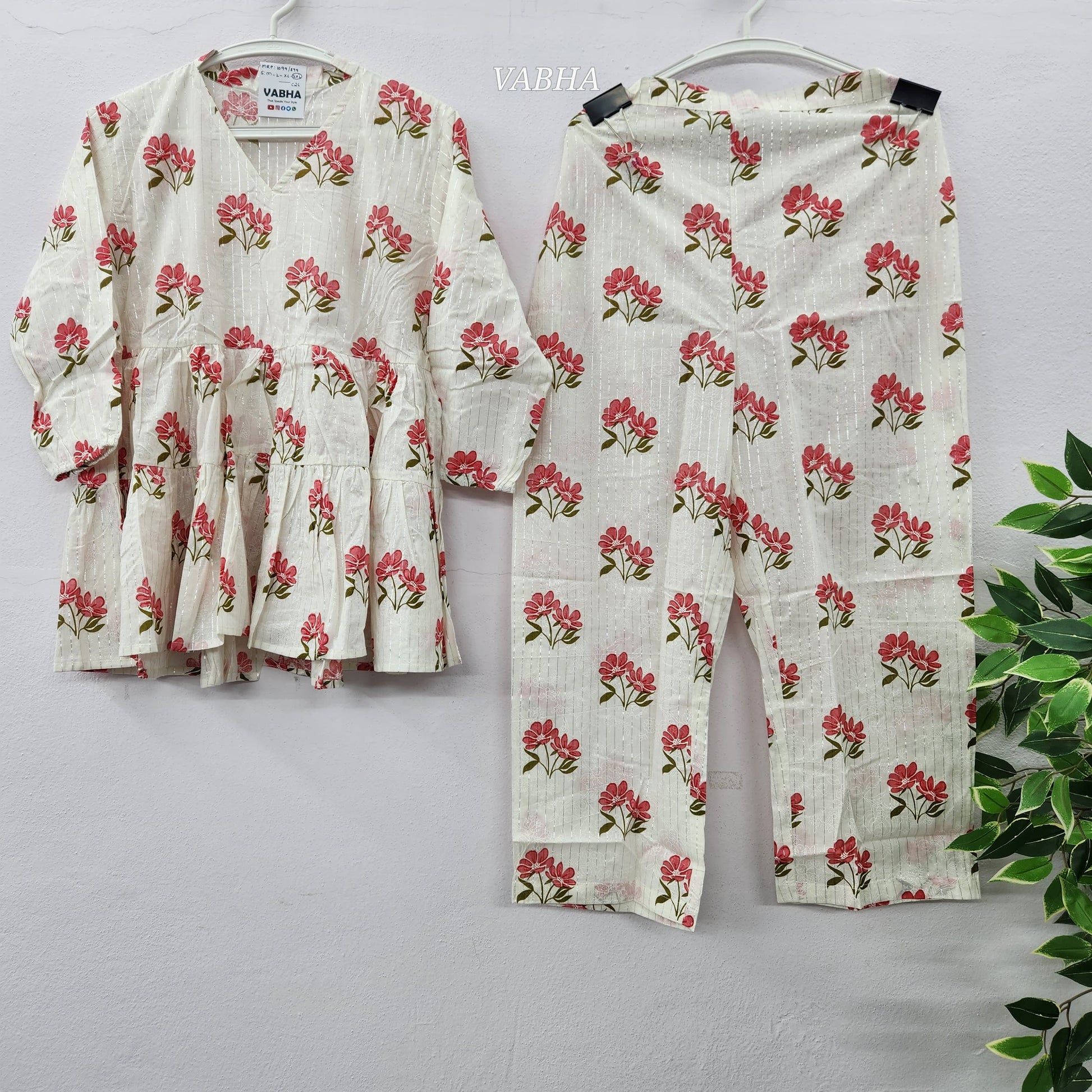 C26 Cream Red Floral Collared V Neck Cotton Short Co-Ord Set