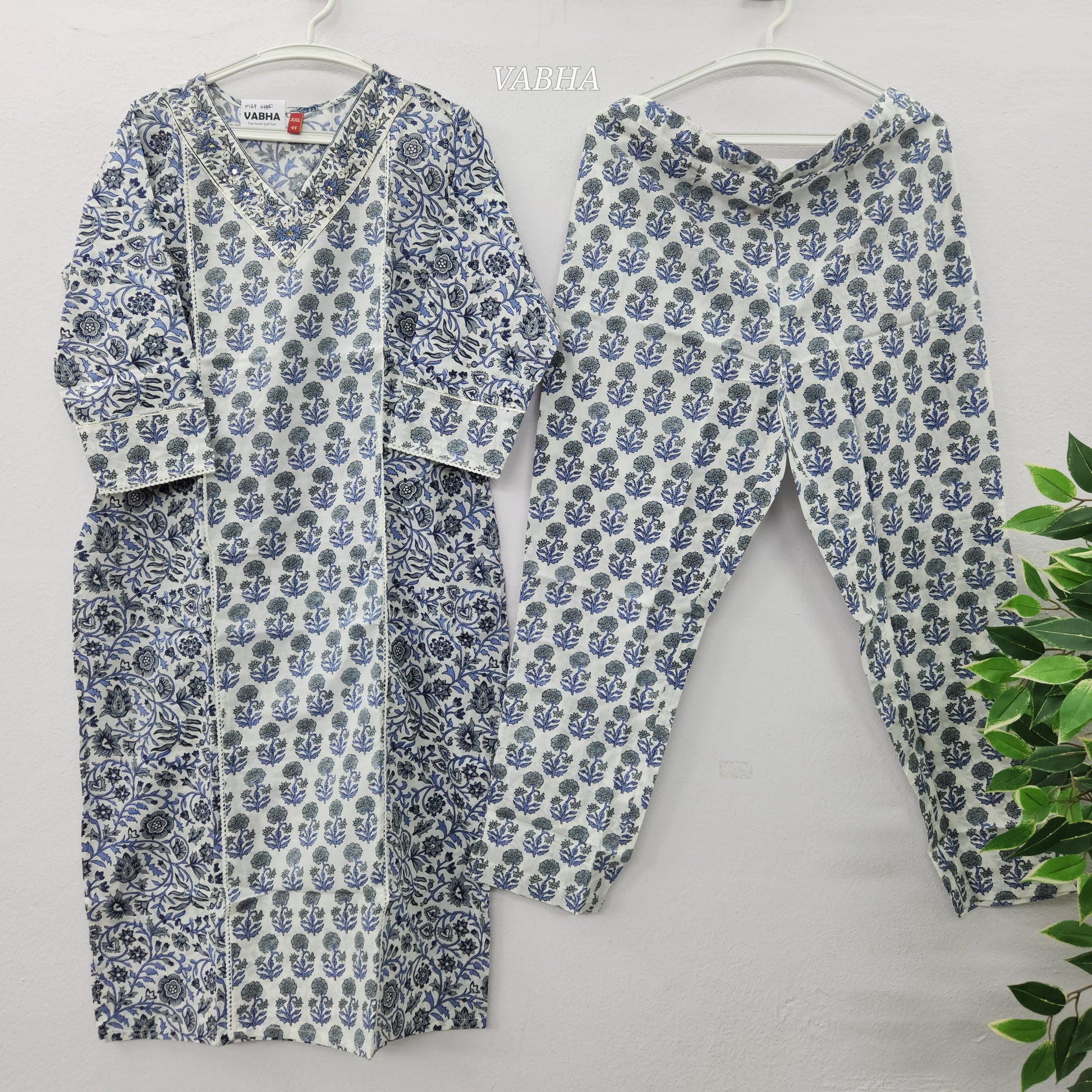 C34 White Blue Floral Print Cotton Co-Ord Set