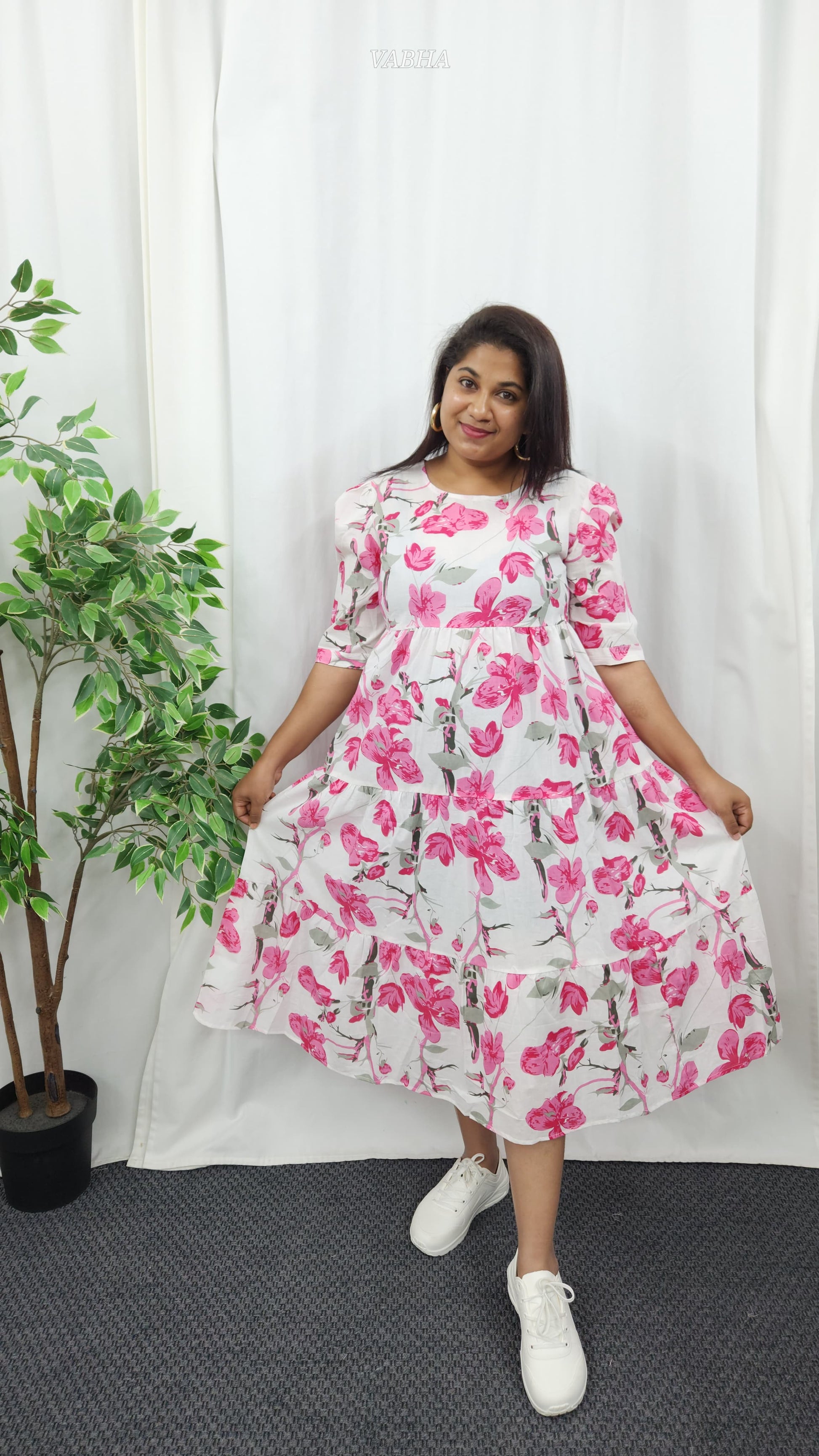 F39 White Pink Floral Cotton Frock