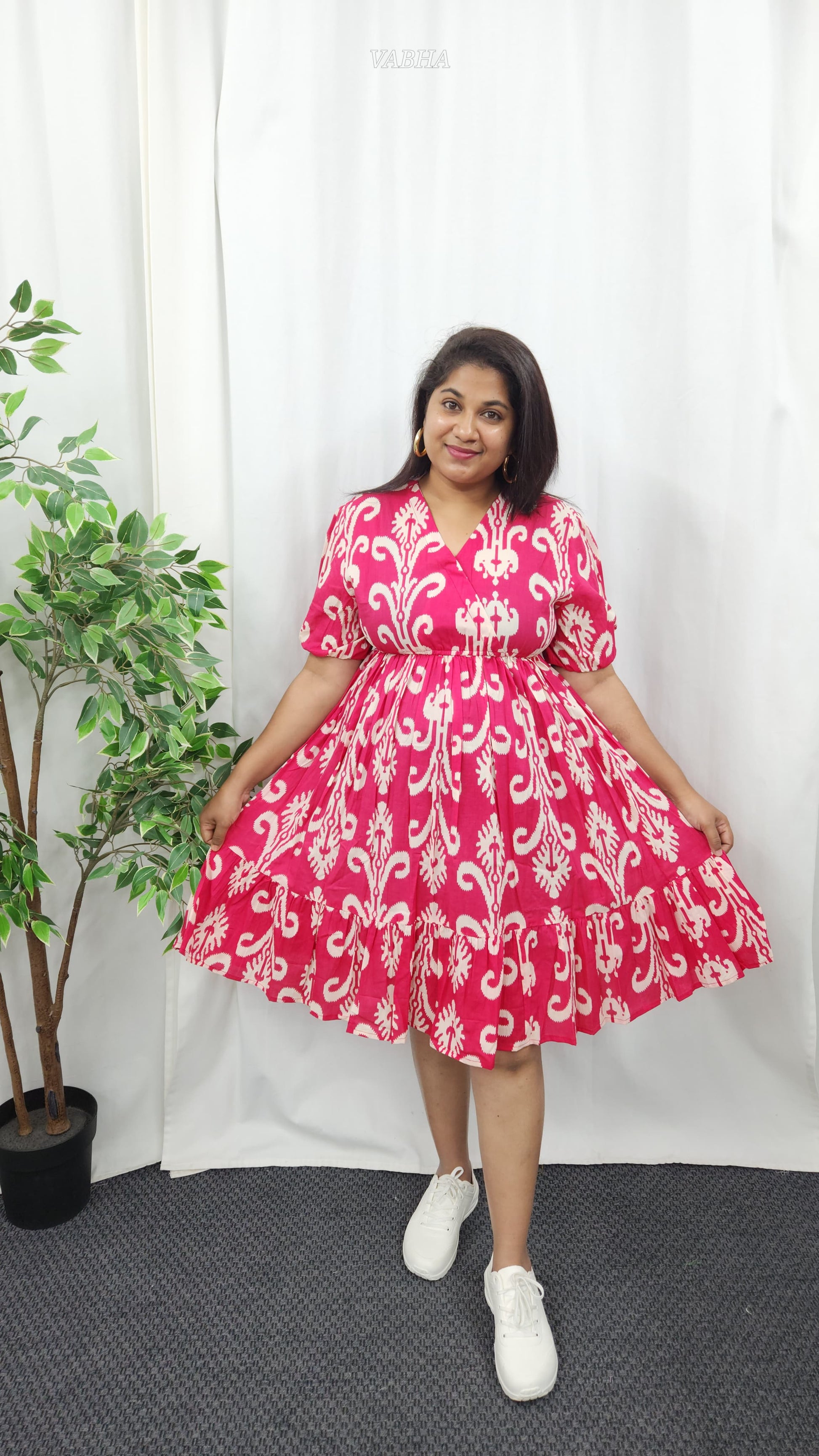 F44 Pink Ikkat Printed V Neck Cotton Frock