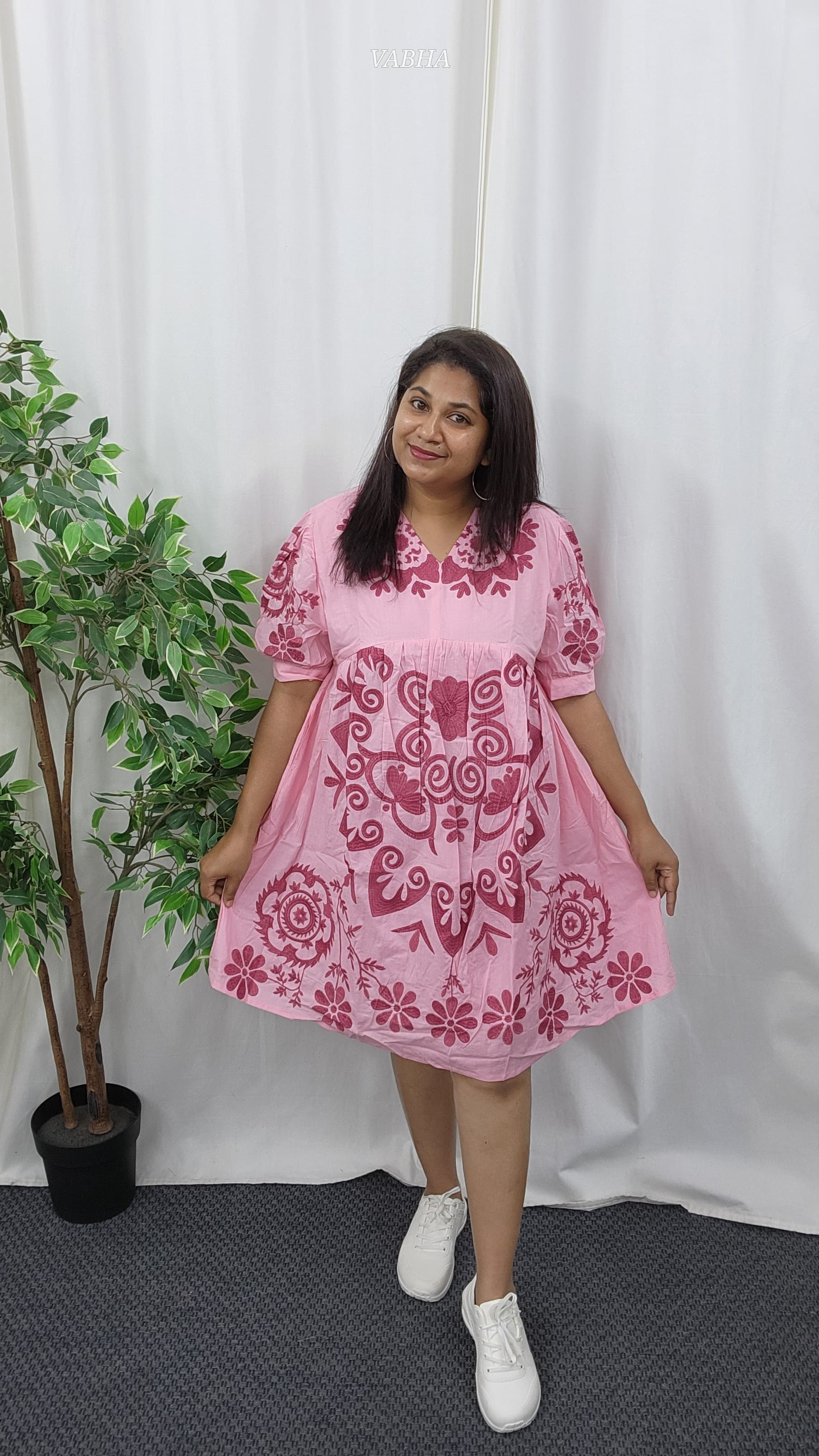 F48 Pink Thread Embroidery V Neck Cotton Frock