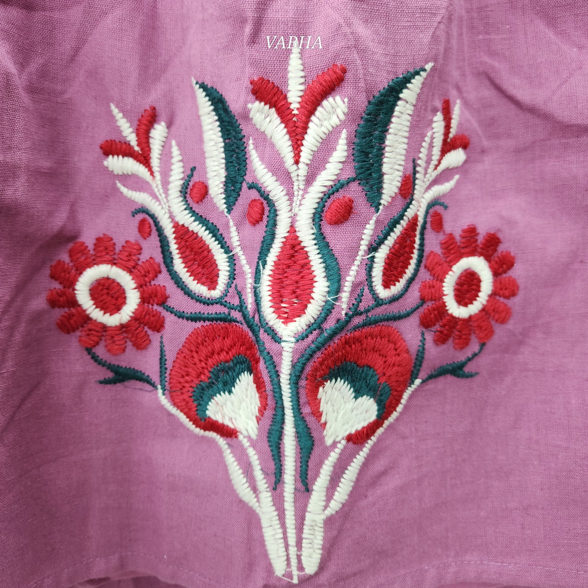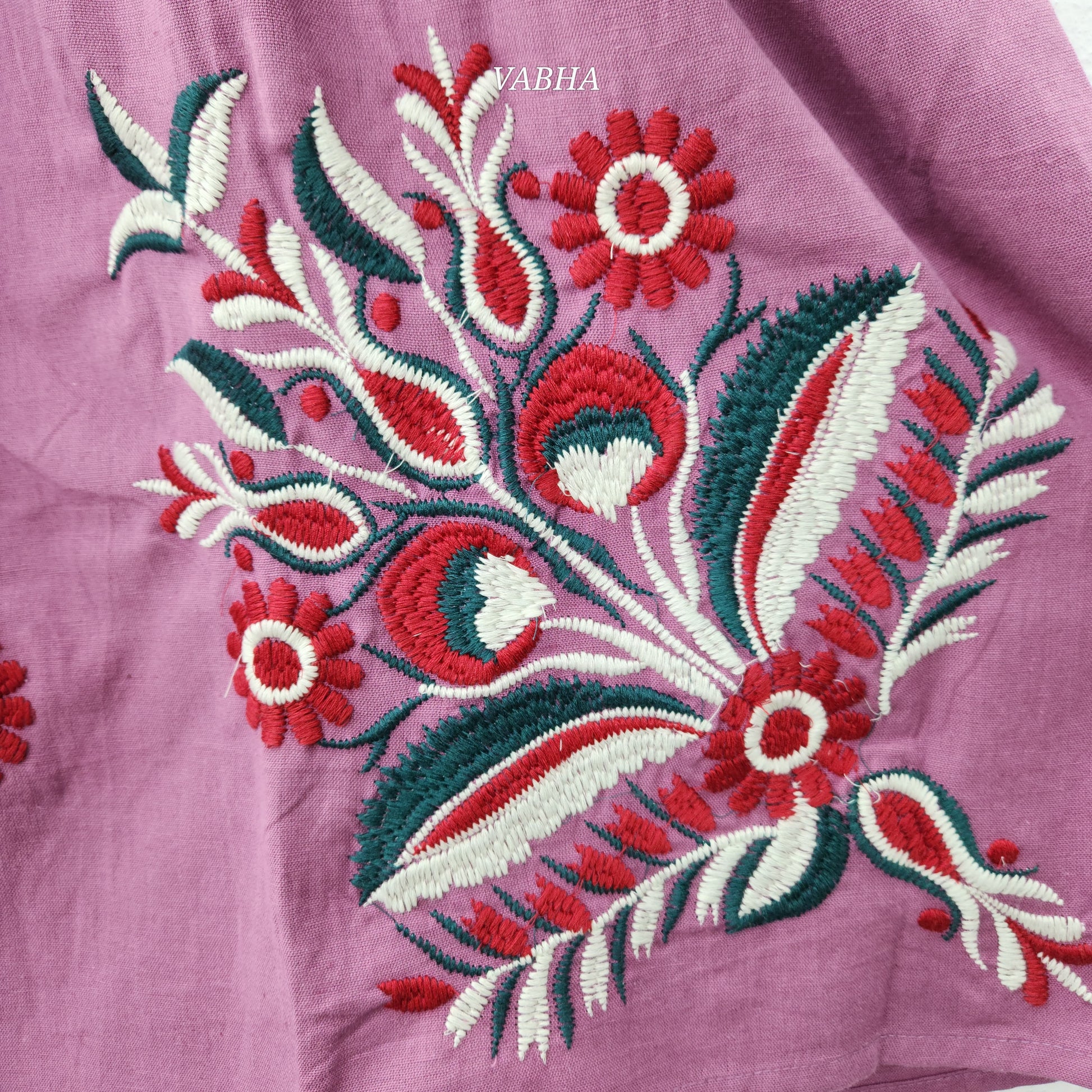 F52 Pink Multi Thread Embroidery V Neck Alia Cut Cotton Frock with pockets with lining