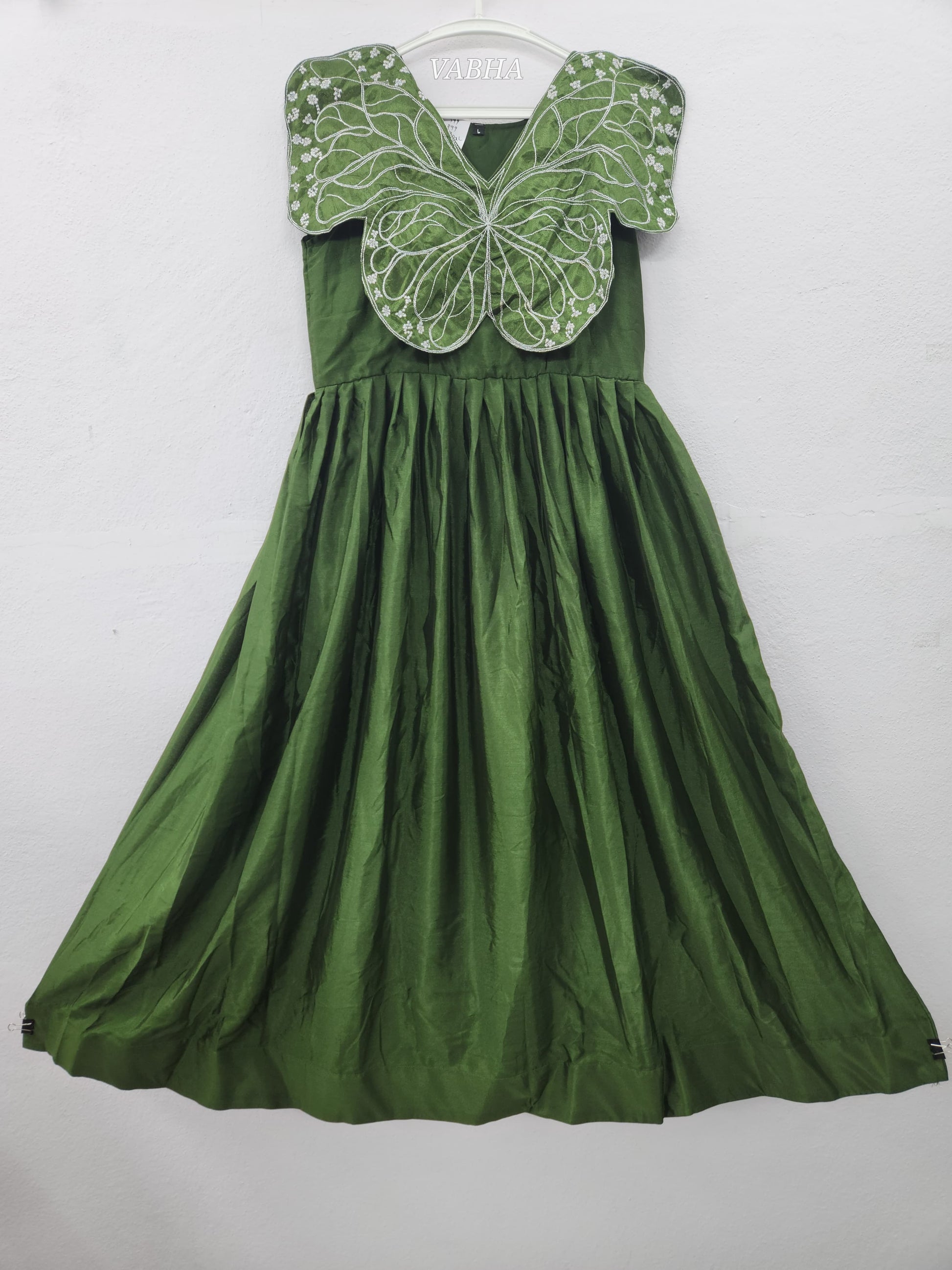 F59 Green Colour Full Length Vichitra Silk Butterfly Pattern Frock