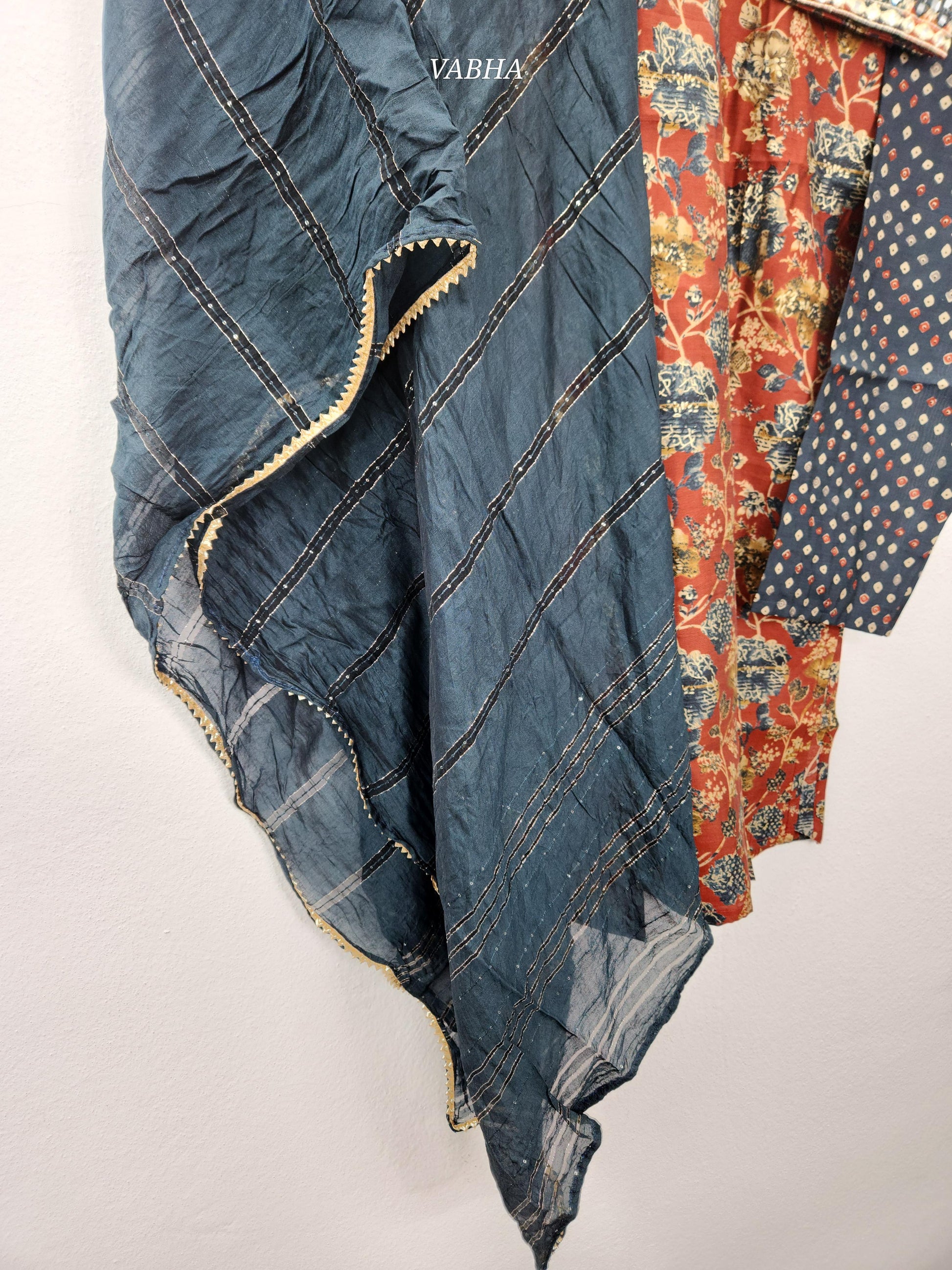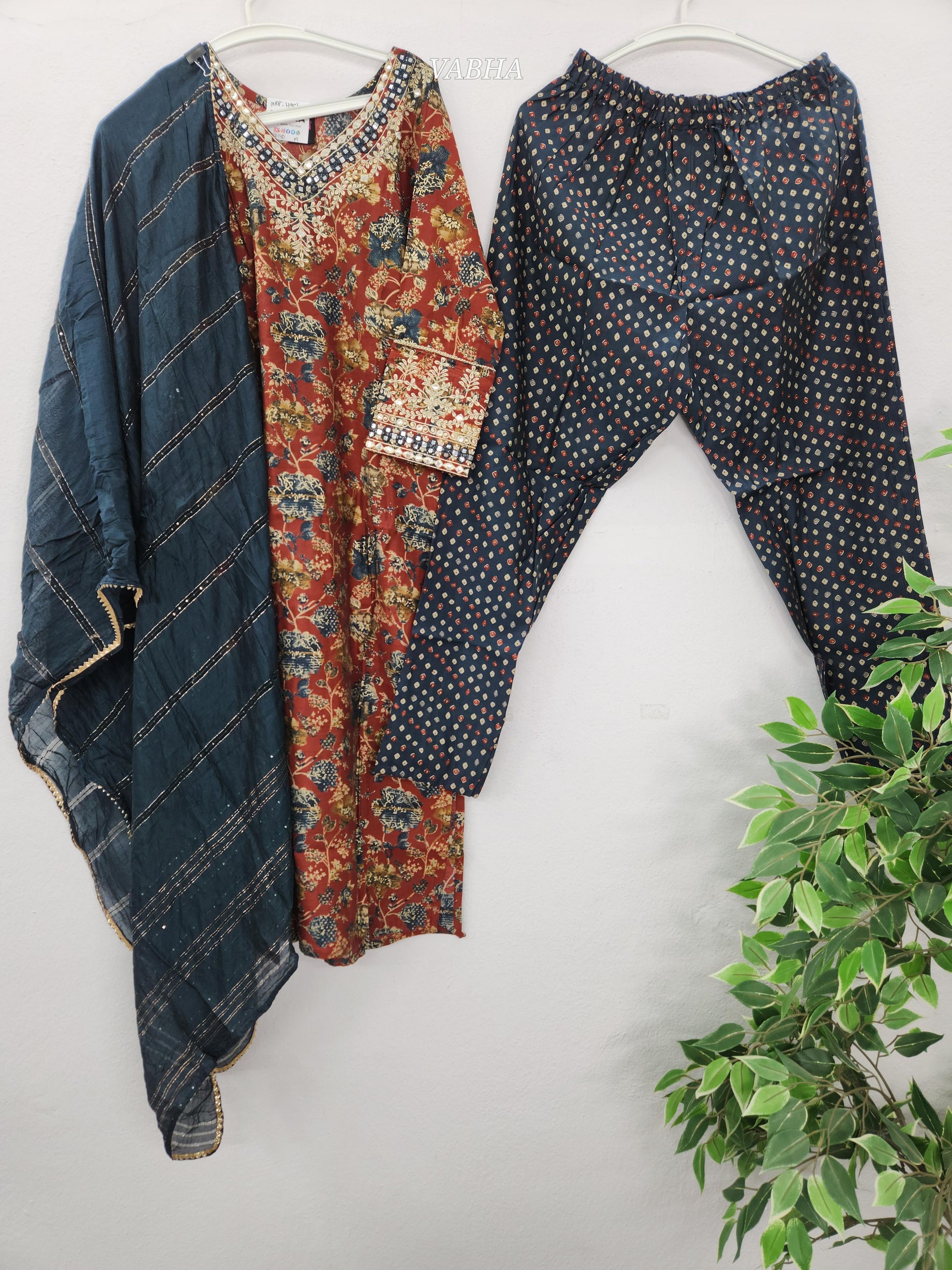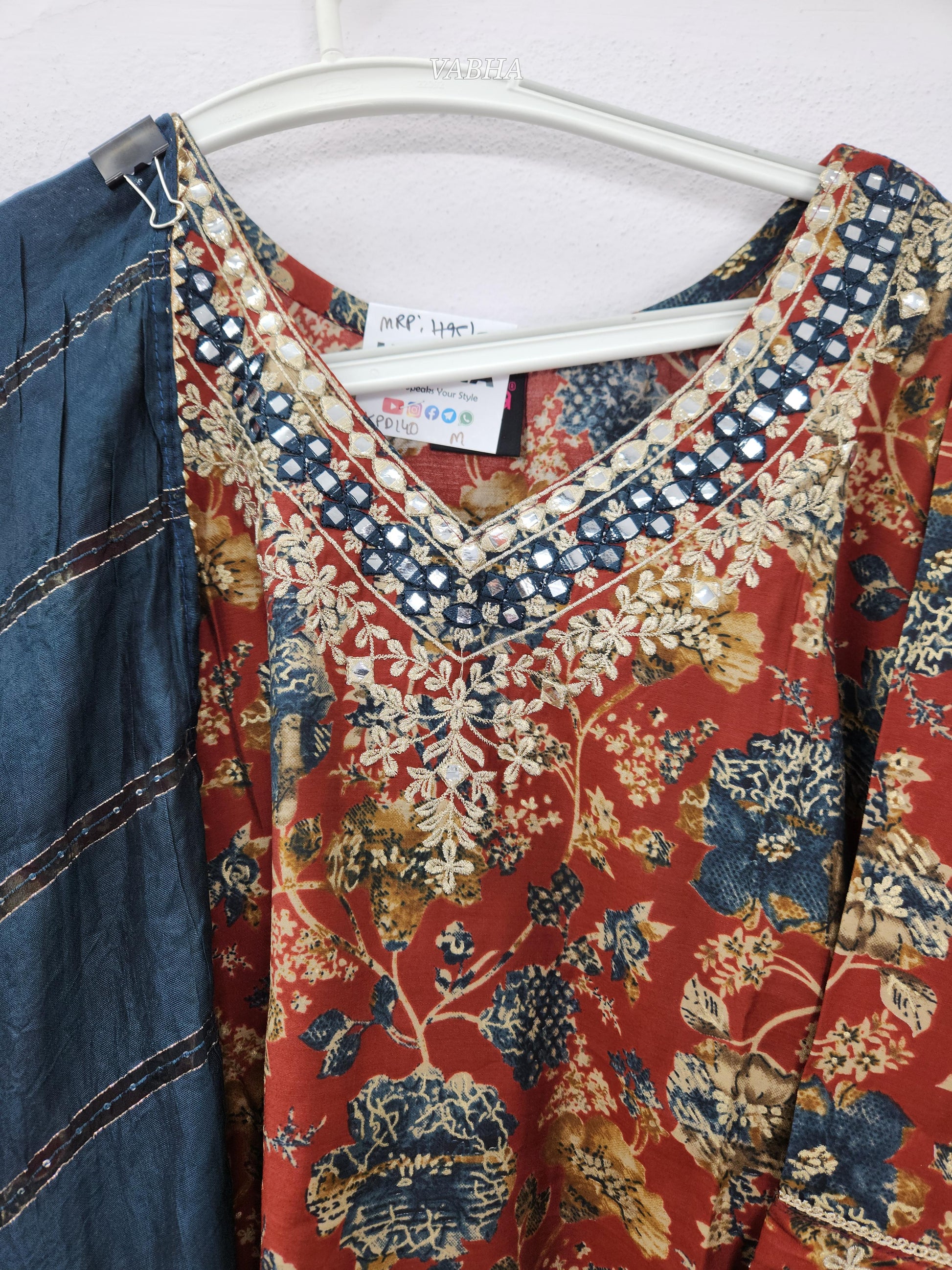KPD140 Brick Red Modal Silk Curvy V neck With Zari Embroidery Floral Print Straight Cut Kurti Pant Duppatta
