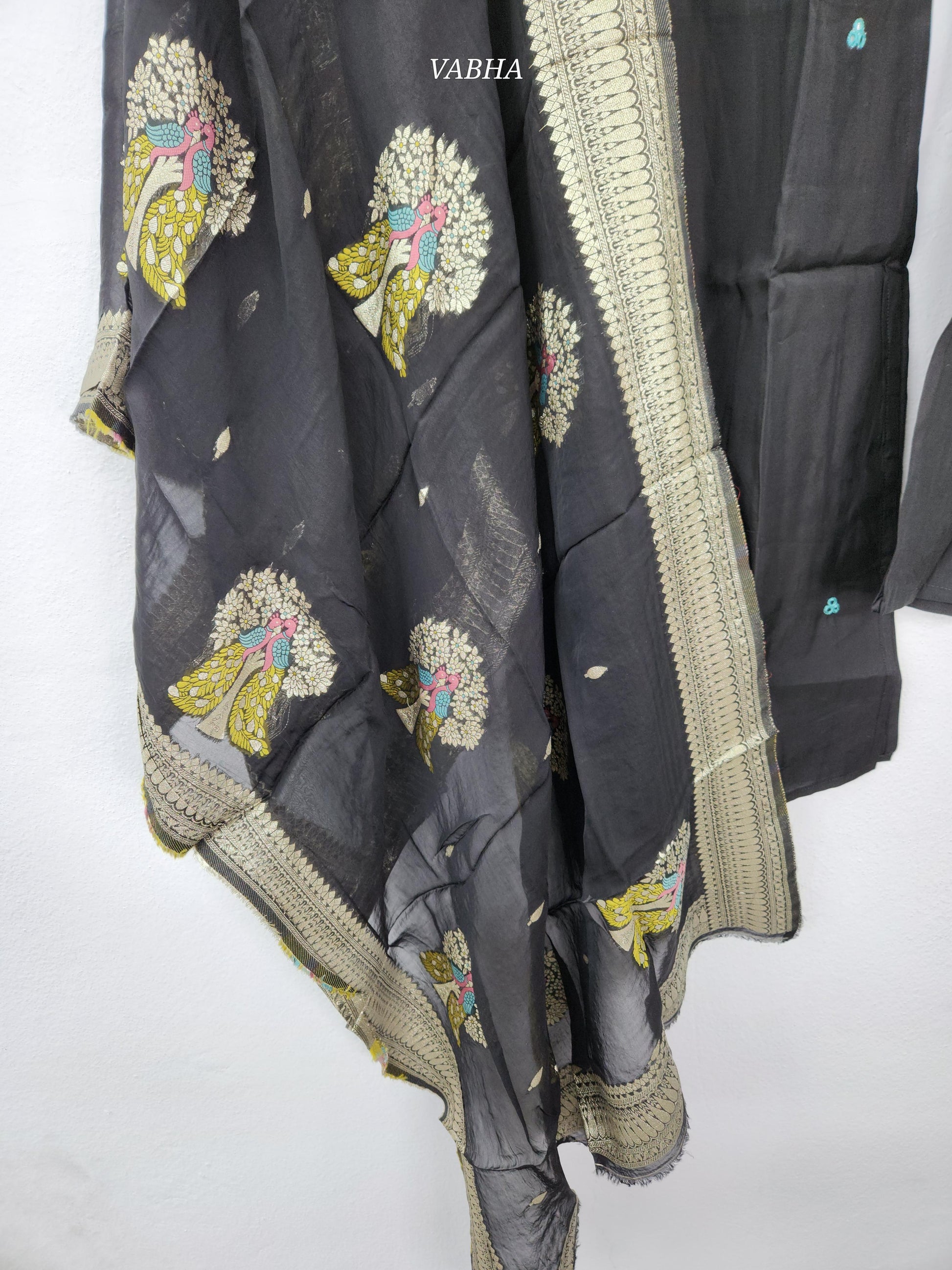 KPD149 Black Roman Silk V neck With Multi Colour Thread embroidery Straight Cut Kurti Pant Duppatta