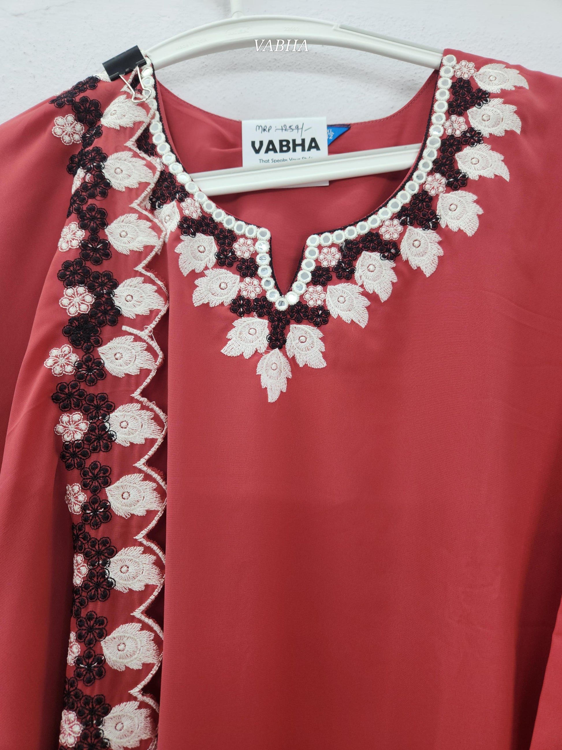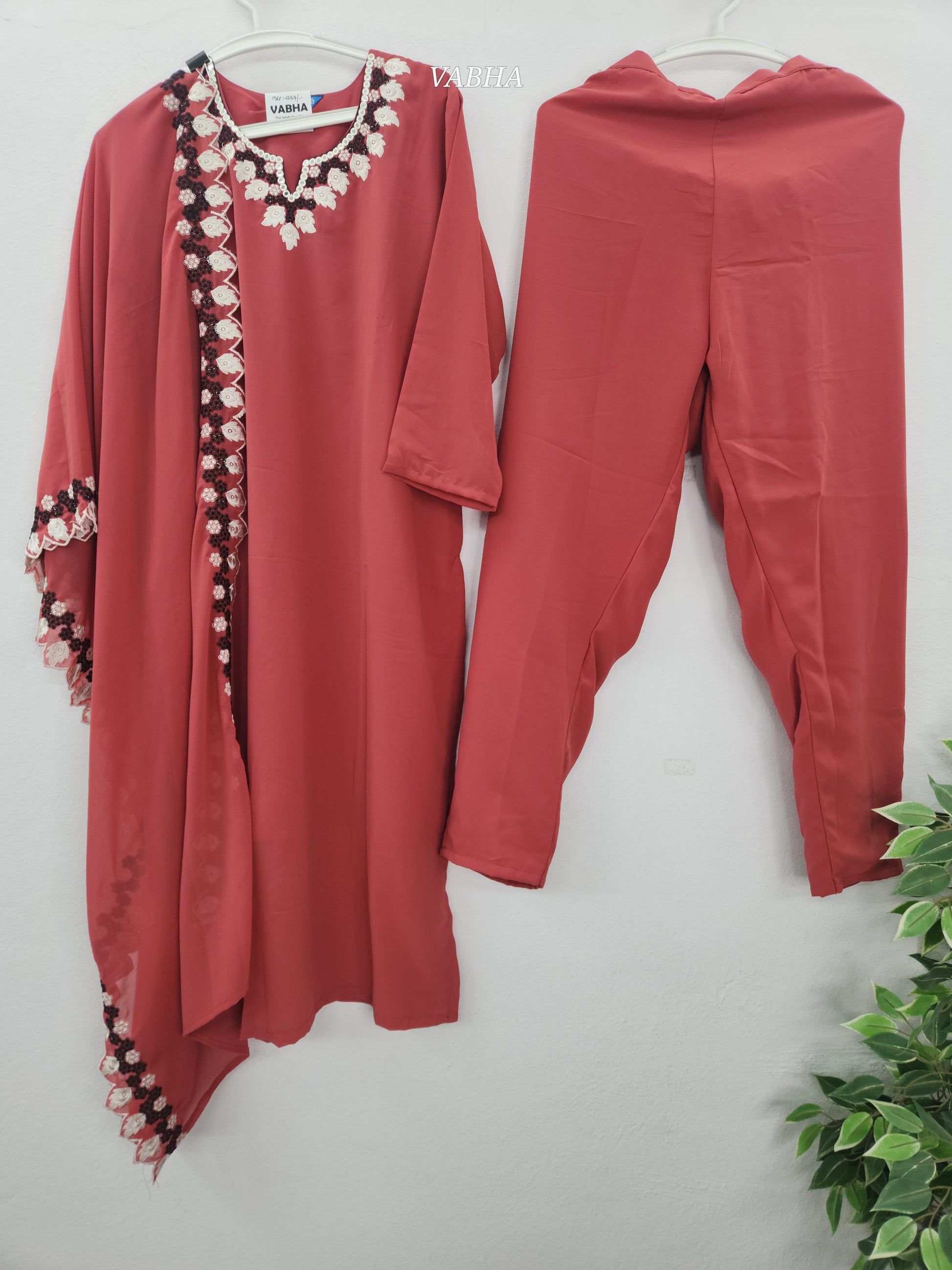 KPD186 Pink Georgette Round With V Neck Thread Embroidery With Lining Straight Cut Kurti Pant Duppatta