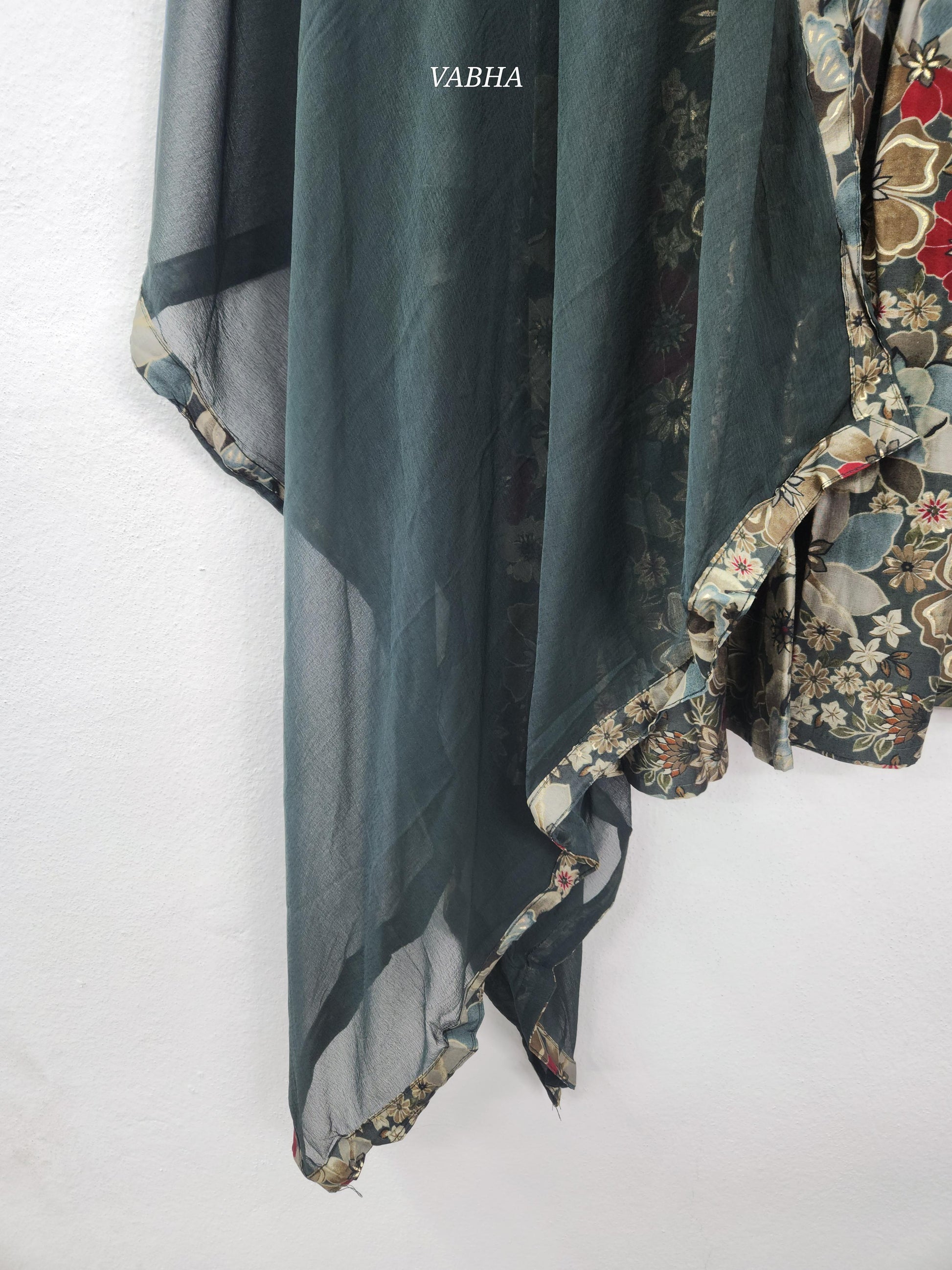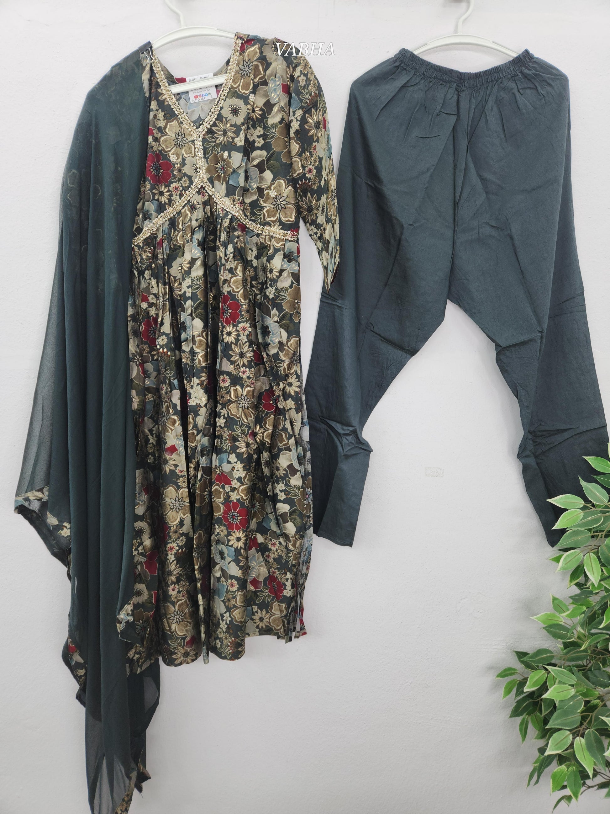 KPD188 Grey Modal Silk V Neck Alia Cut Pattern Pearl Zari Work Straight Cut Kurti Pant Duppatta