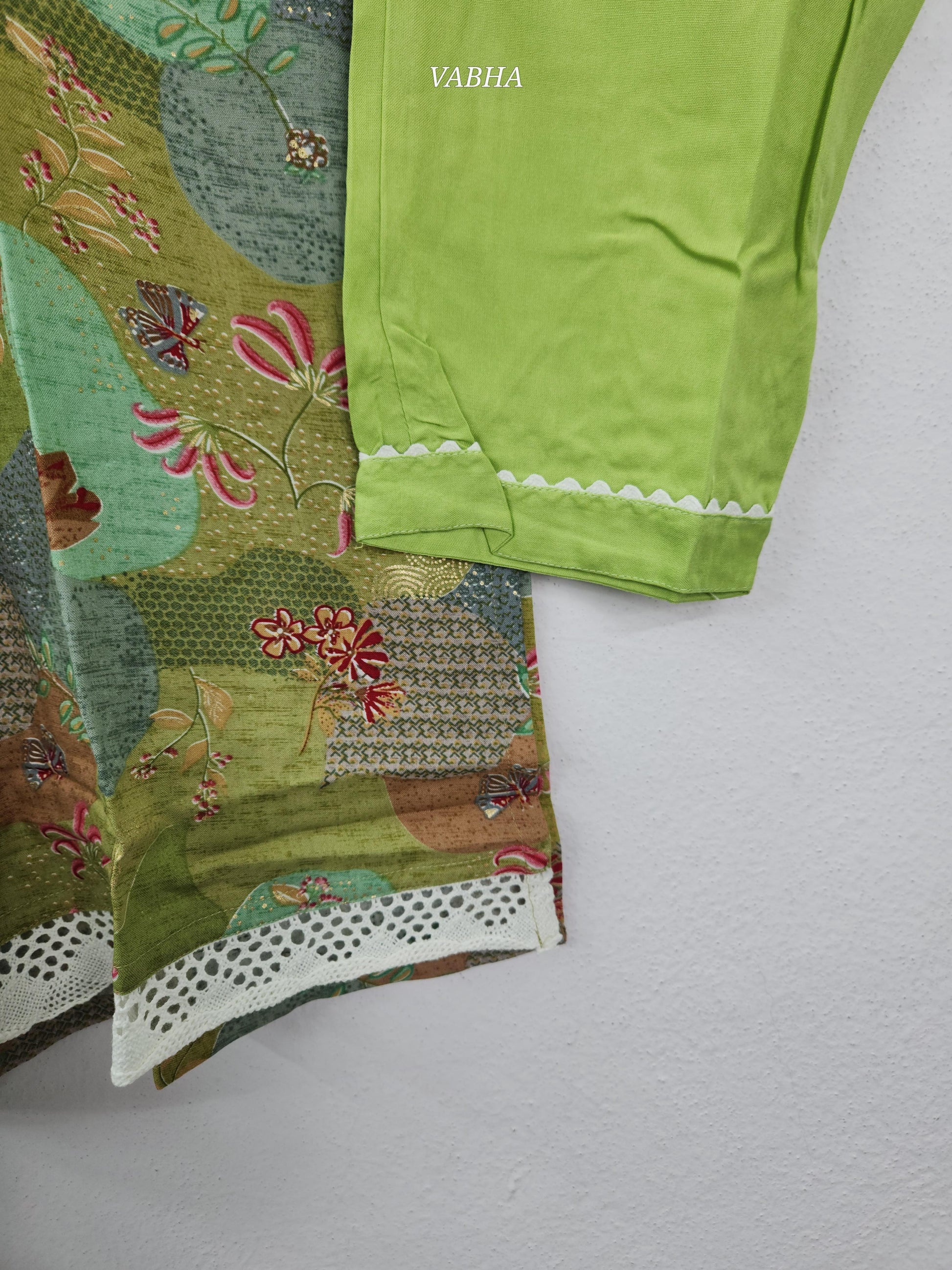 KPD211 Green Rayon Round Neck Floral Printed Thread Embroidery Straight Cut Kurthi Pant Duppatta