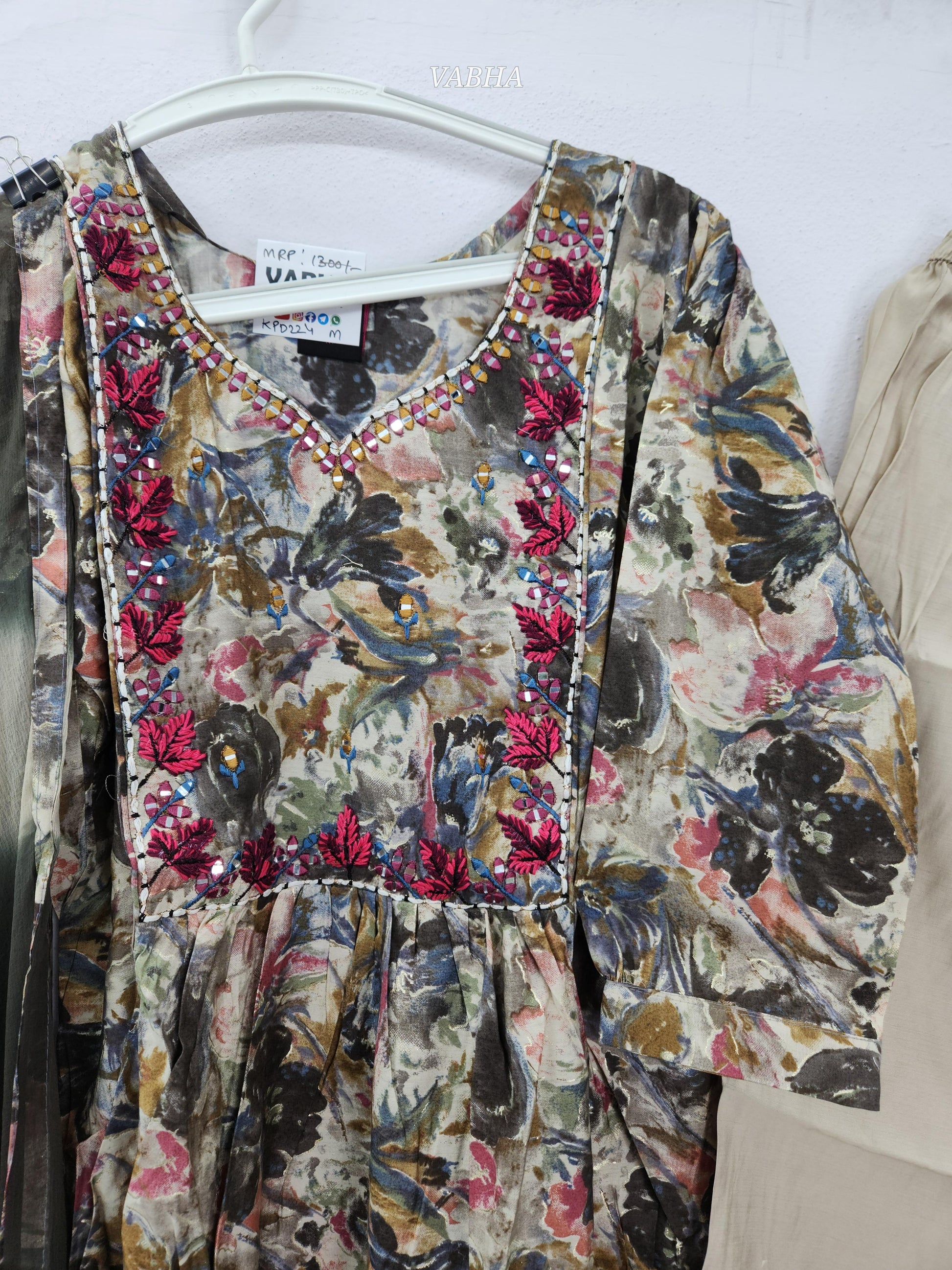 KPD224 Grey Pink Modal Silk Curvy V Neck Floral Print Straight Cut Kurthi Pant Duppatta