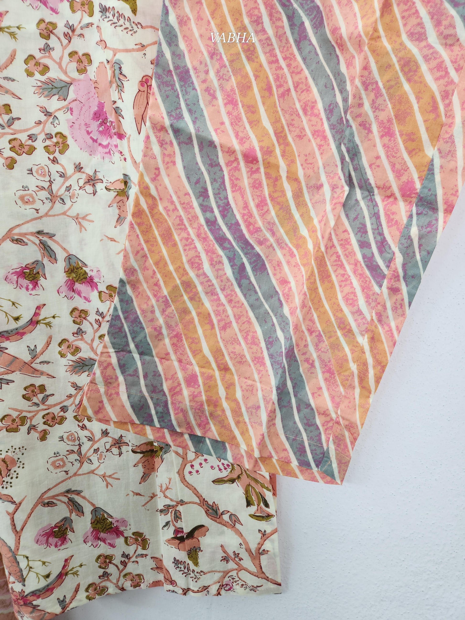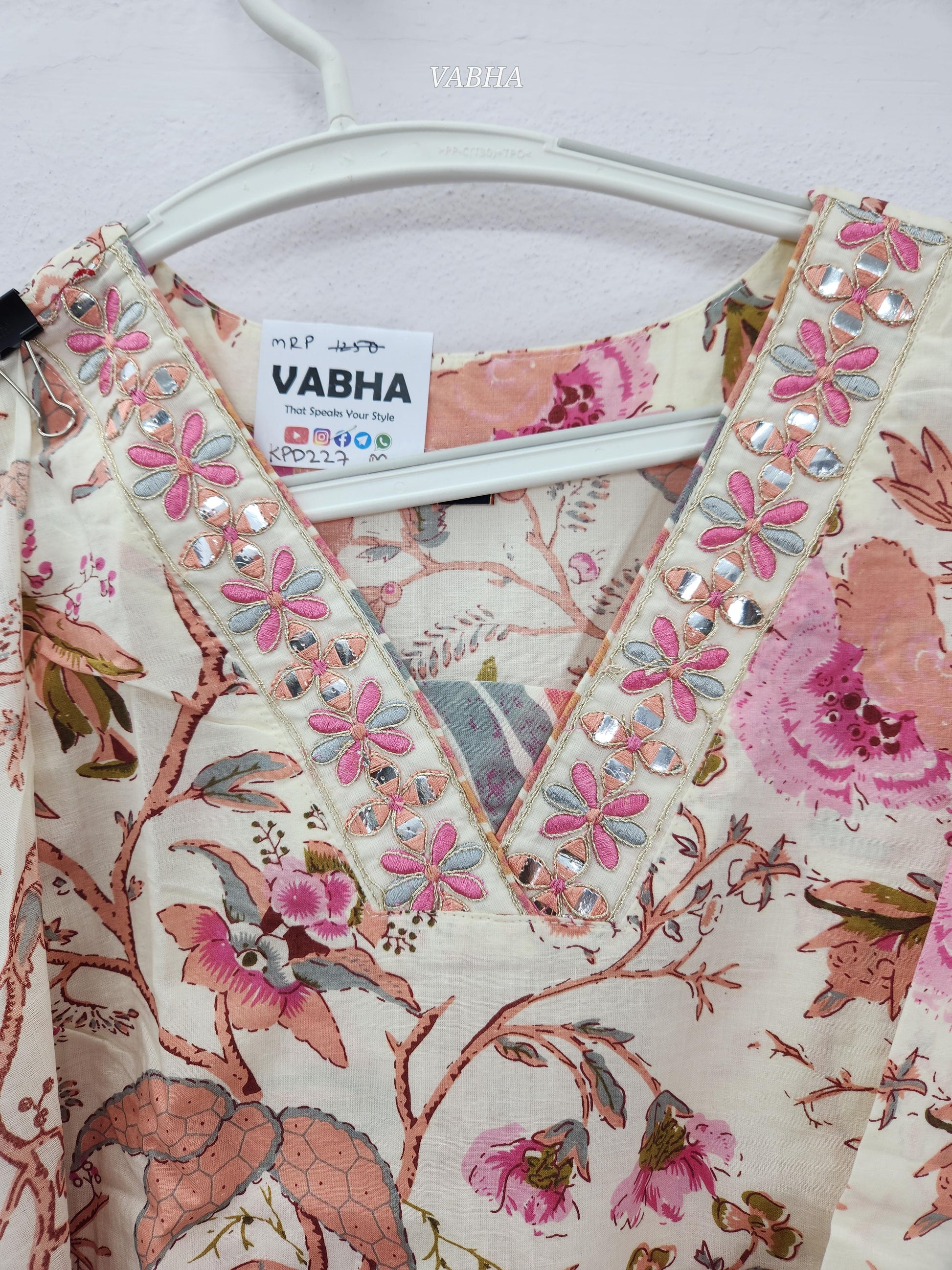 KPD227 Cream Pink Cotton V Neck Thread Embroidery Straight Cut Kurthi Pant Duppatta