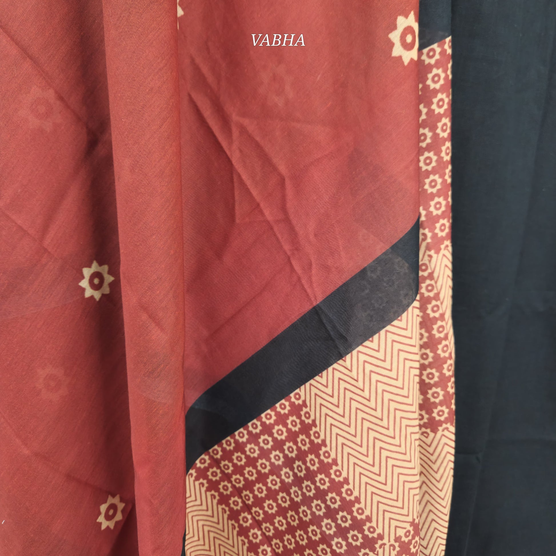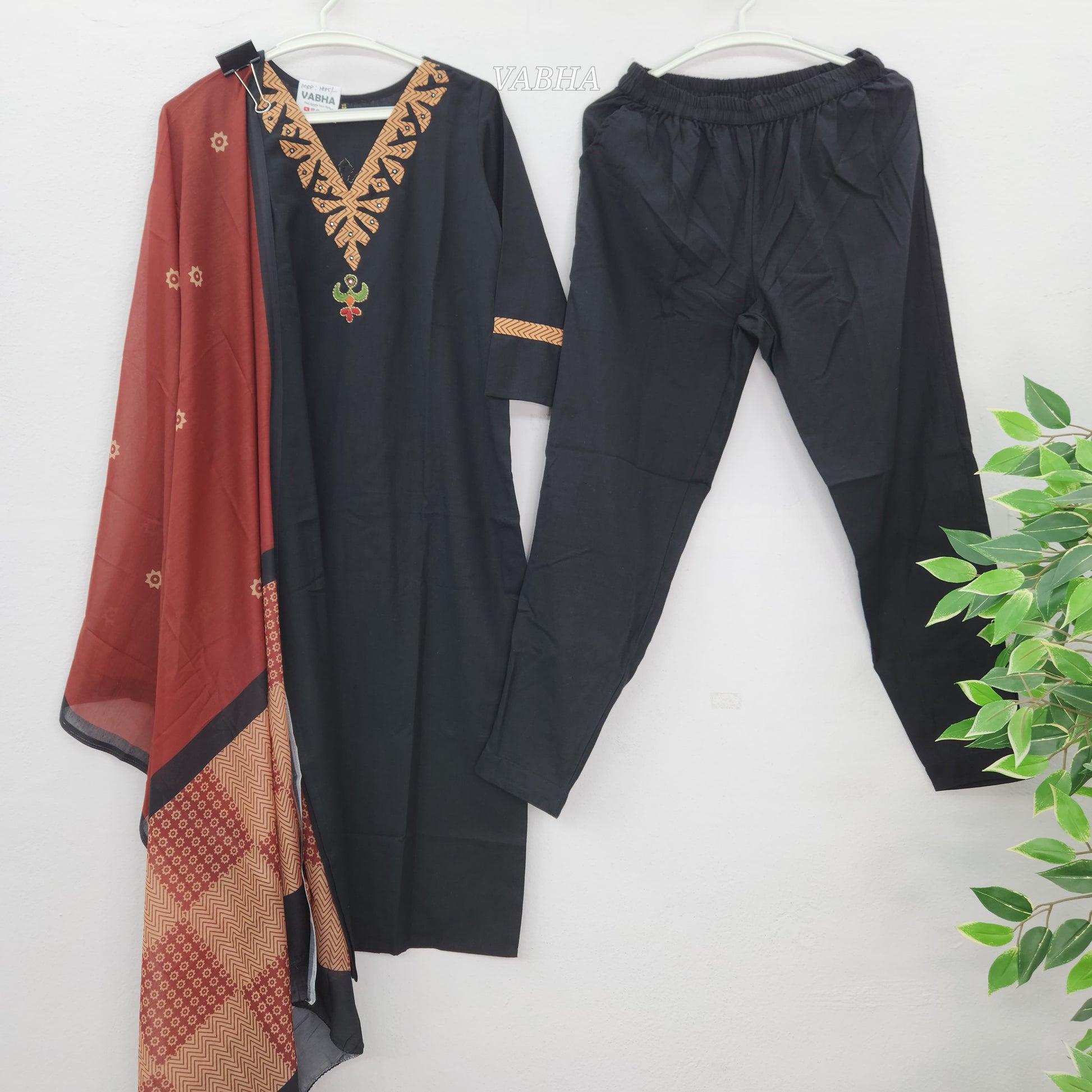 KPD60 Black V-neck Applique Design Straight Cut Cotton Kurti Pant Dupatta