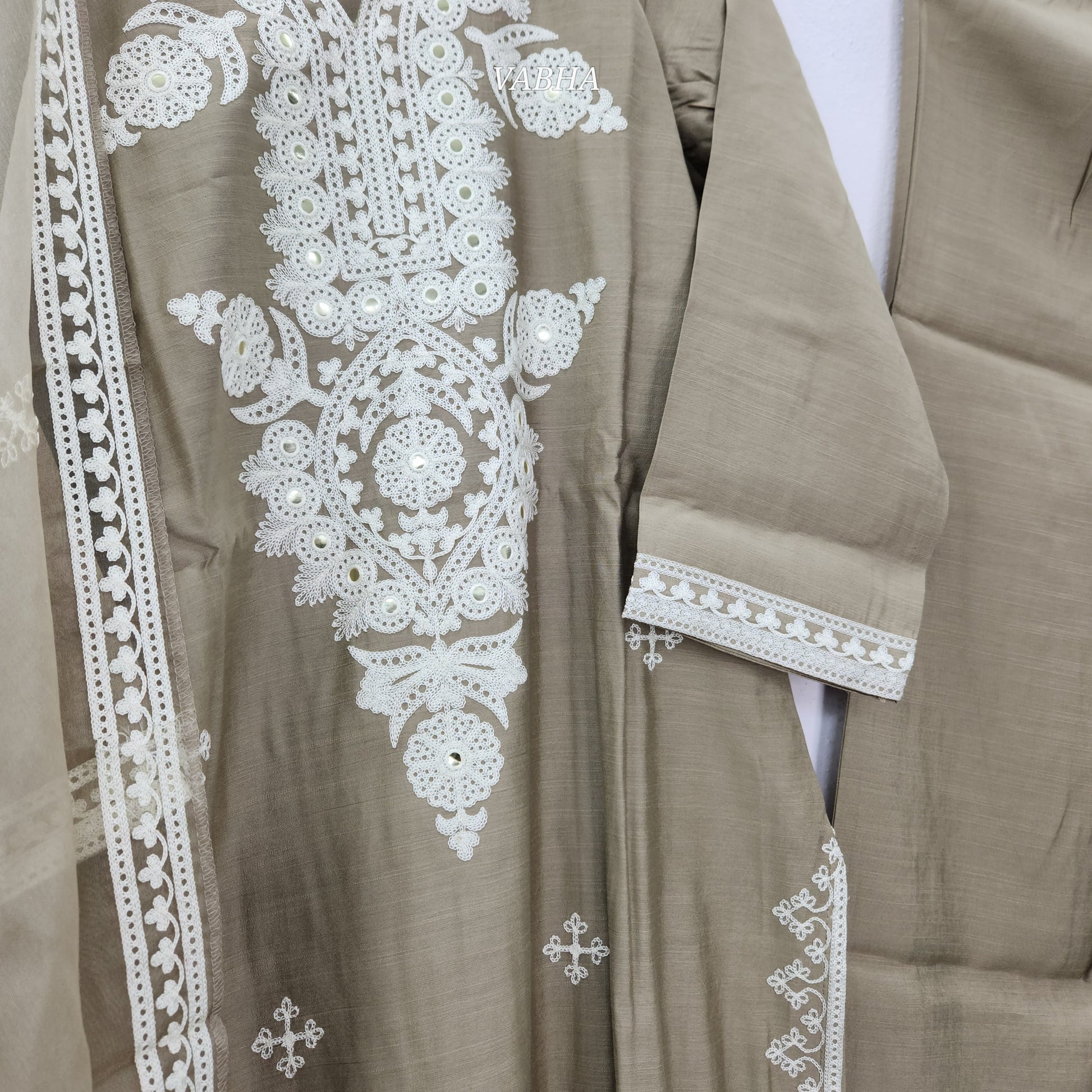 KPD69 Soft Roman Silk Thread Embroidery Beige Colour Kurti Pant and Organza Dupatta