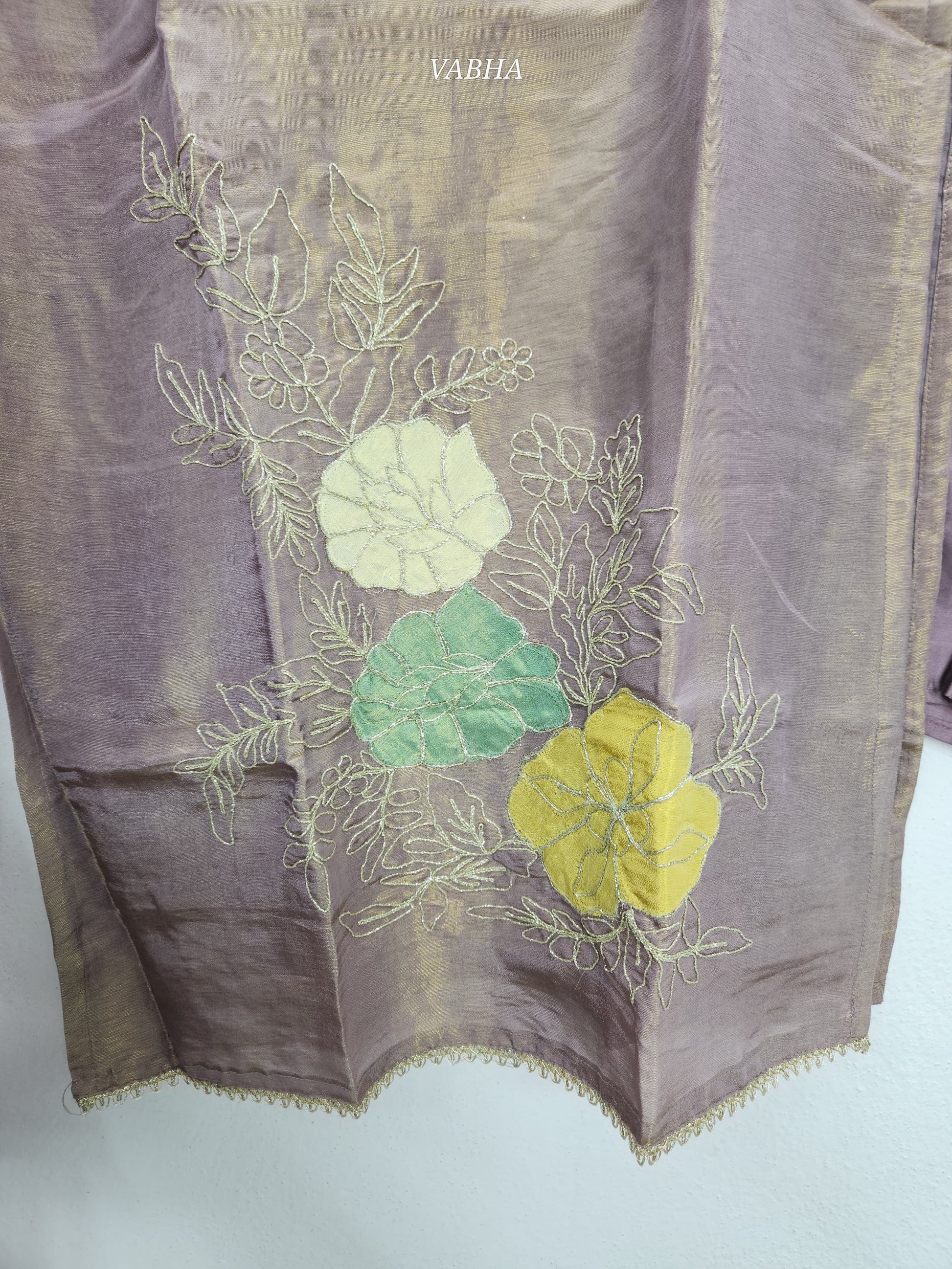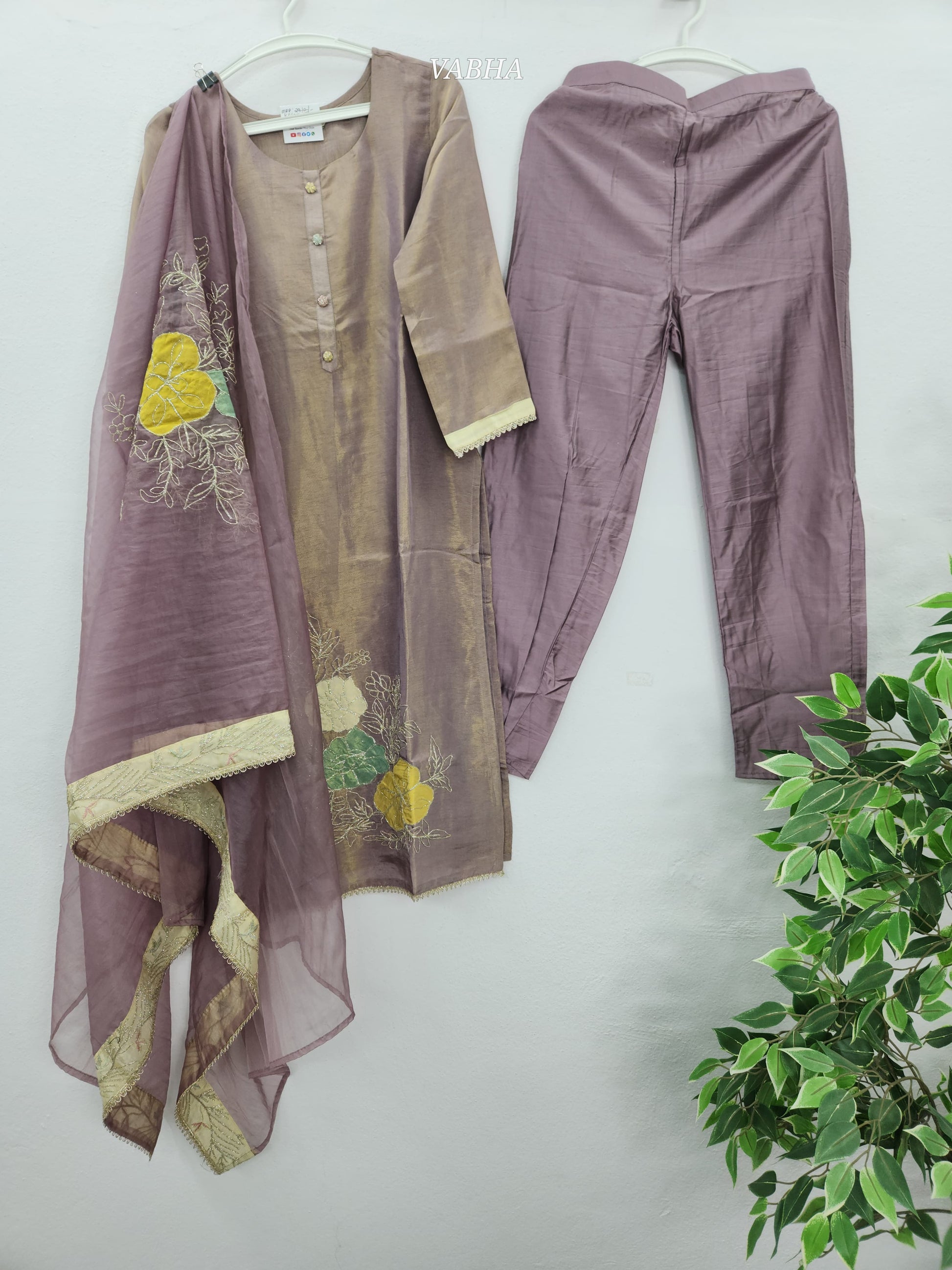 KPD85 Purple Grey Tissue Round Neck Kurti With Lining Organza Dupatta and Pant